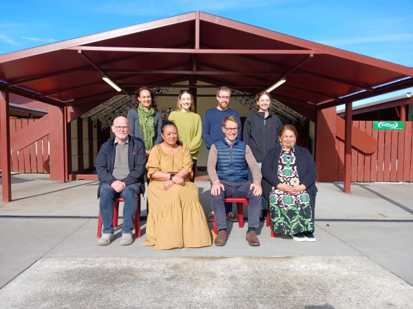 BACK ROW, from left to right: Fellows (Dr Natalie Netzler, Dr Theresa Pankhurst, Dr Andrew Highton, Dr Alice-Roza Eruera); FRONT ROW, from left to right: Distinguished Professor Nigel French, Te Pora Thompson, Sir Ashley Bloomfield, Glenda Raumati
